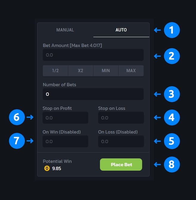 Dice games can be set up to play rounds automatically, so the player does not have to click the play button for each round. There are five (5) options to choose from when setting up auto-play. If none of the options is selected, the game will go on until your bankroll runs out.