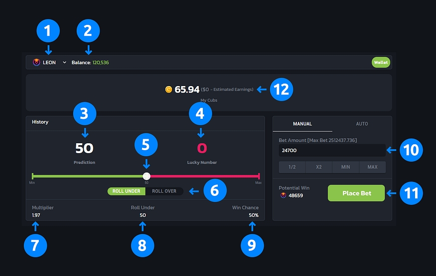 Visit https://dex.leonicornswap.com/dice to play Dice.